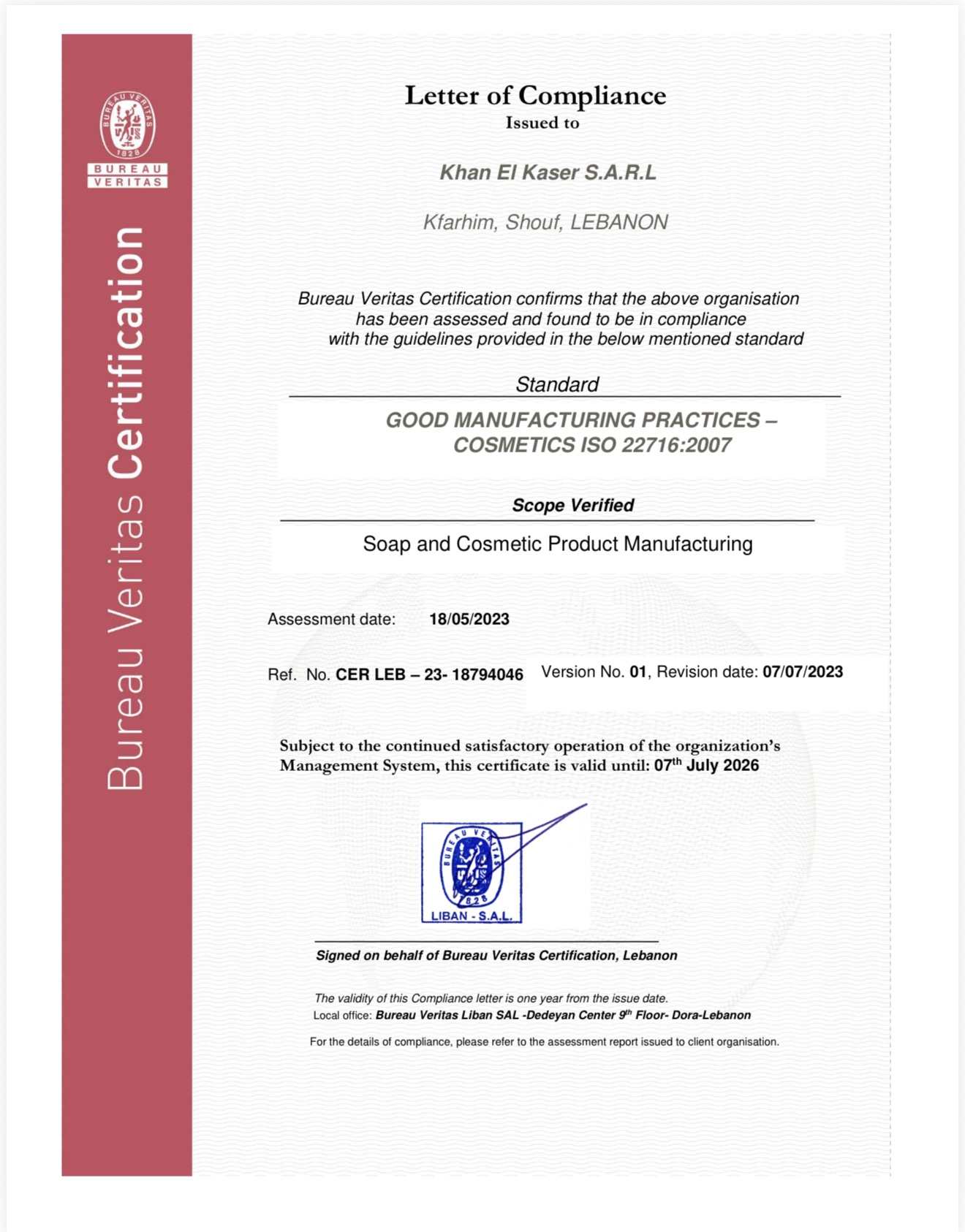 نفتخر إن كل منتج نبيعه مصنوع في مصنع حاصل على شهادة ISO 22716:2007، المعترف بها عالميًا كمعيار لتصنيع مستحضرات التجميل بأعلى جودة.