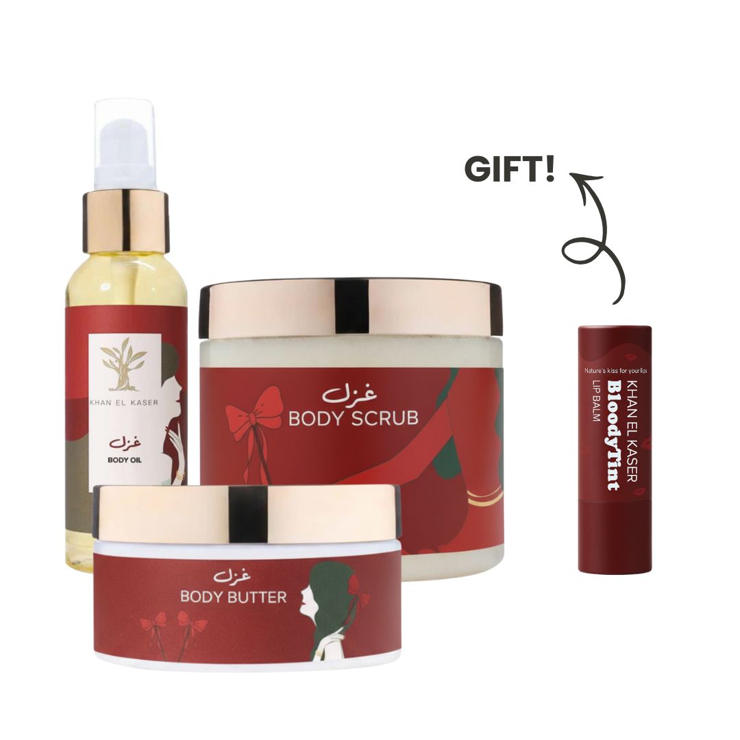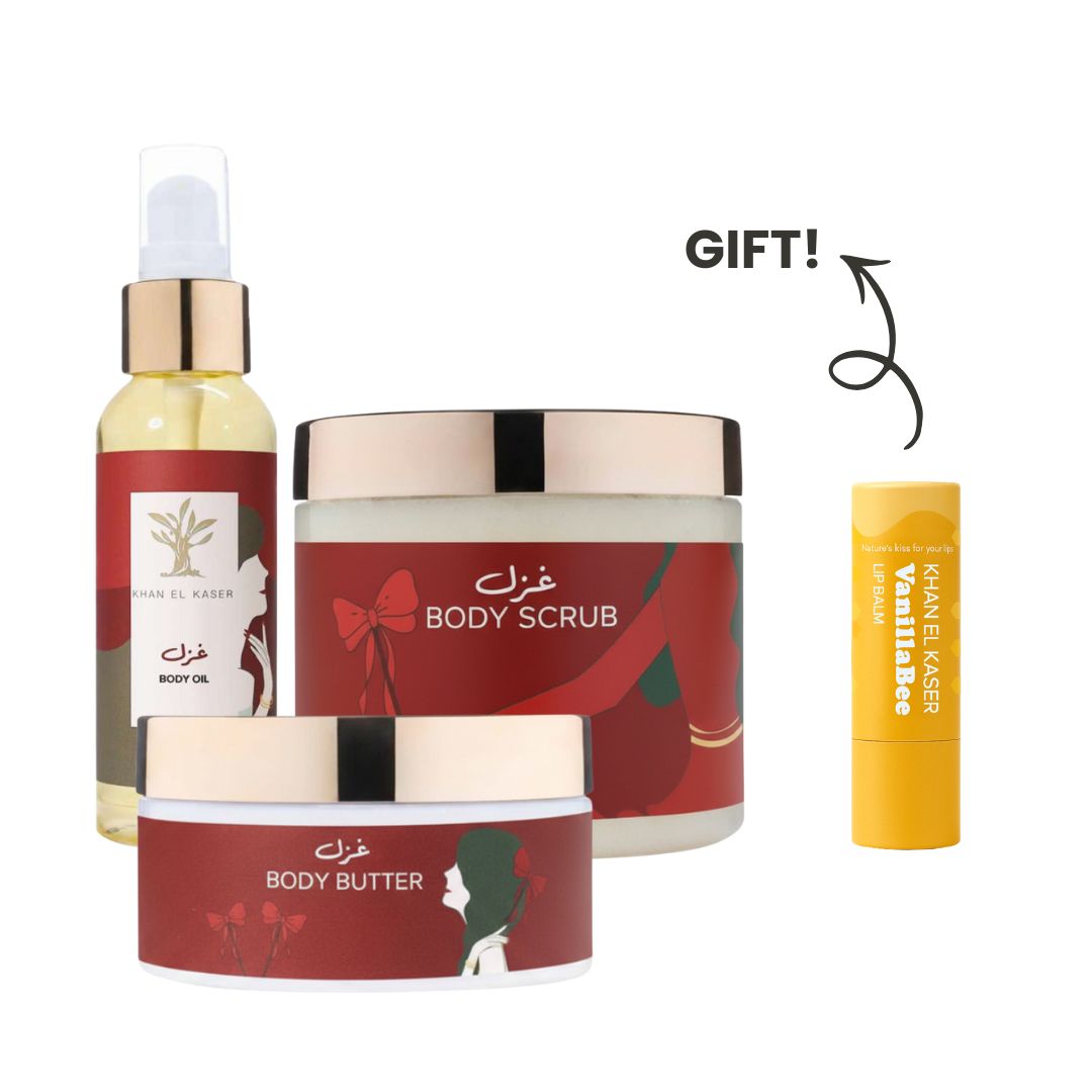 دللي نفسك بأناقة غزل السهلة. هذه الباقة مصممة لتقدم تغذية عميقة، إشراقة ناعمة، وعناية فاخرة في روتينك اليومي. أكملوا طقوسكم ببلسم الشفاه المجاني من اختياركم للحصول على شفاه ناعمة ومشرقة تتماشى مع بشرتكم المتألقة.