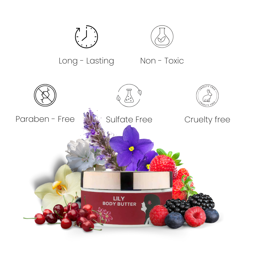 Lily Body Butter is packed with essential vitamins and antioxidants that help restore your skin’s natural hydration. It’s your go-to for treating dry, rough areas—leaving your skin soft, smooth, and nourished.