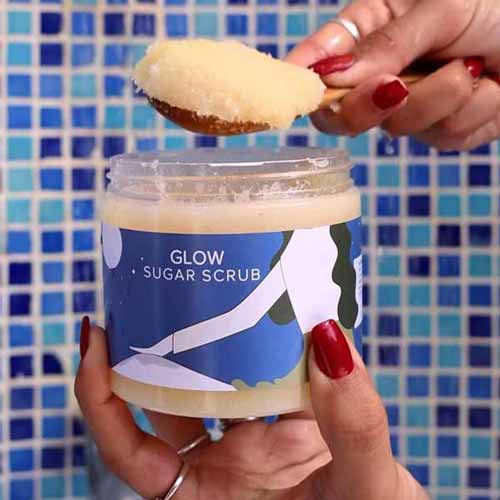 - Scoop a small amount of your sugar scrub, gently massage onto damp skin in circular motion