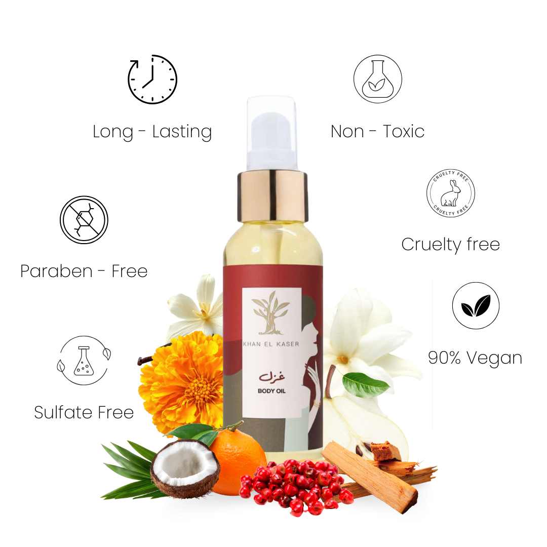 Ghazal Body Oil is a lightweight, fast-absorbing formula that nourishes the skin and delivers a smooth, natural glow. Designed for warm and humid weather, it sinks in quickly without leaving a heavy film. Perfect for everyday wear, gym days, or evening routines. The scent opens with fresh citrus and florals, settling into creamy vanilla and warm woods inspired by the Golden Rule. Use it alone or layered for extra softness, radiance, and long-lasting scent.